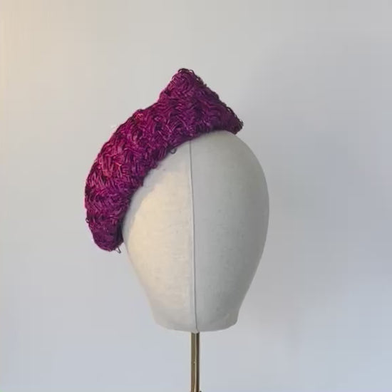 A small beret in textured vintage straw-cloth with a bow. Hand-dyed in a deep plum shade. This piece requires delicate handling due to the nature of the weave. Only four made in this style and colour.