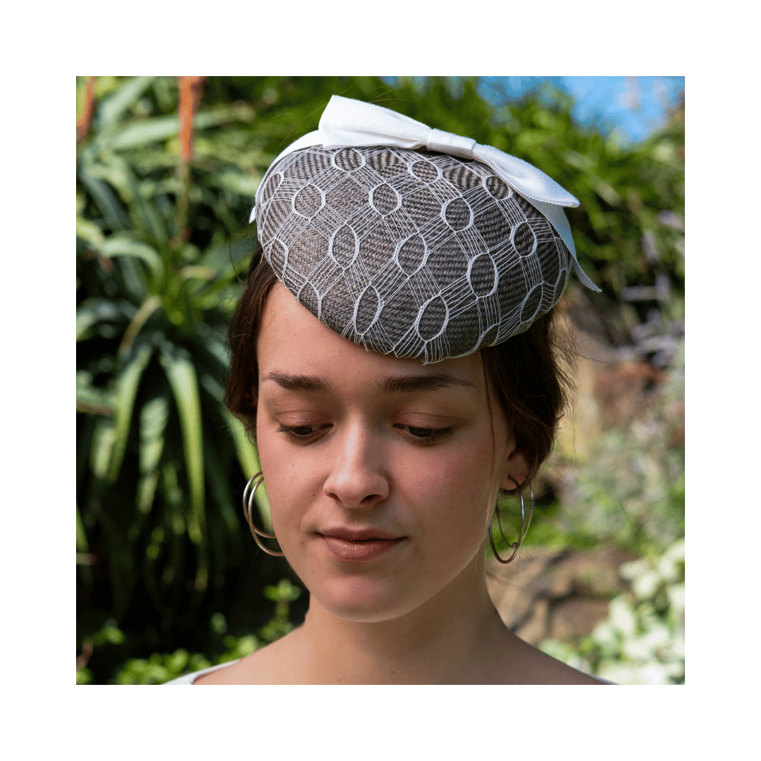 Steel-grey beret with vintage French veiling overlay and finished off with a tailored ribbon bow.